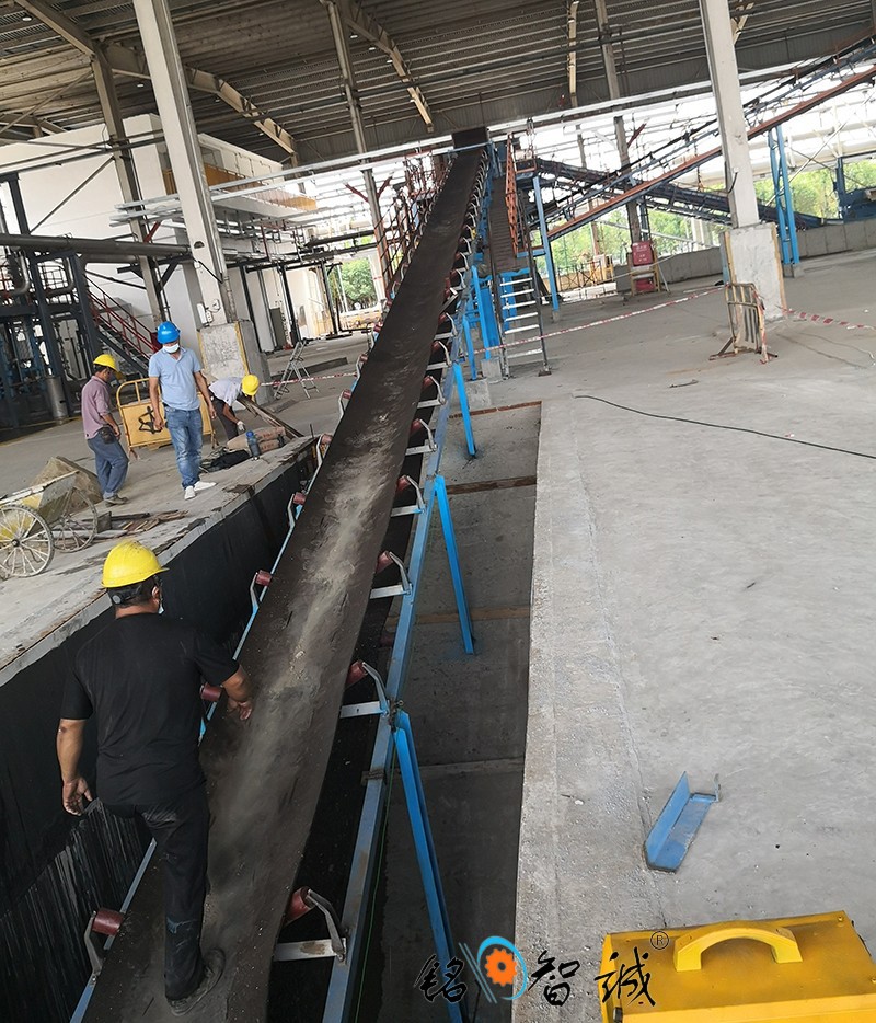 旋轉(zhuǎn)式皮帶輸送機(jī)其結(jié)構(gòu)是在平形橡膠運(yùn)輸帶兩側(cè)粘上可自由伸縮的橡膠波形立式"裙邊”, 在裙邊之間又粘有一定強(qiáng)度和彈性的橫隔板組成匣形斗,使物料在斗中進(jìn)行連續(xù)輸送。擋邊帶式輸送機(jī)可廣泛用于煤炭、糧食、建材、化工、水電和冶金等部門,在環(huán)境溫度為- 19°C ~ +40°C范圍內(nèi),輸送堆積比重為0.5-2.5t/m3的各種散狀物料。對(duì)于輸送有特殊要求的物料,如高溫、具有酸、堿性、油類物質(zhì)或有機(jī)溶劑等成分的物料,需采用特殊的擋邊輸送帶。